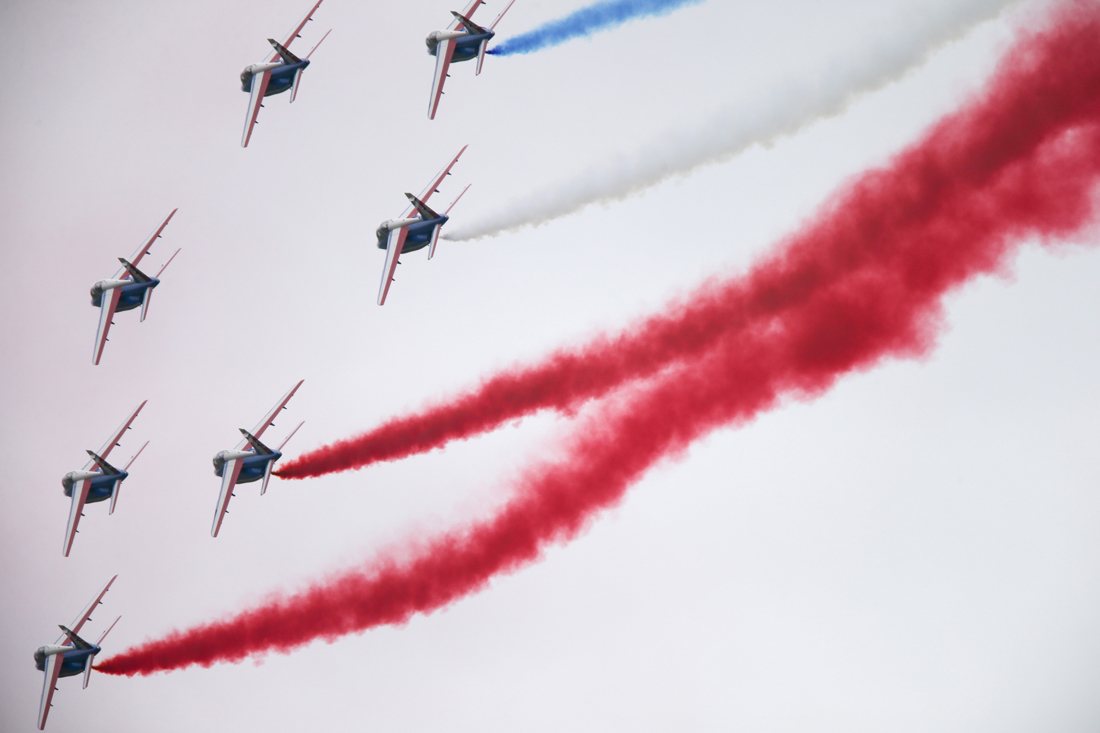 La Patrouille de France a peint en bleu, blanc et rouge le ciel du Bourget, devant des milliers de visiteurs, lors de la 50e édition du Salon de l’aéronautique et de l’espace, le 22 juin 2013. L’Alphajet, dont est équipé la Patrouille, est un petit biréacteur performant, qui décolle en 700 m et atteint Mach 0,86 à 15 000 m. Parfaitement adapté à la formation des pilotes de combat de nombreuses forces aériennes, il dispose d’excellentes qualités de vol et est en service sur les bases de Tours et de Cazaux. Les élèves pilotes reçoivent leur brevet à l’école de l’aviation de chasse basée à Tours, puis suivent un stage de transition opérationnelle à Cazaux. C’est là qu’ils s’initient véritablement à leur futur métier de pilote de chasse lors de missions d’entraînement au tir, à la voltige et au combat aérien, avant de rejoindre les escadrons de chasse.